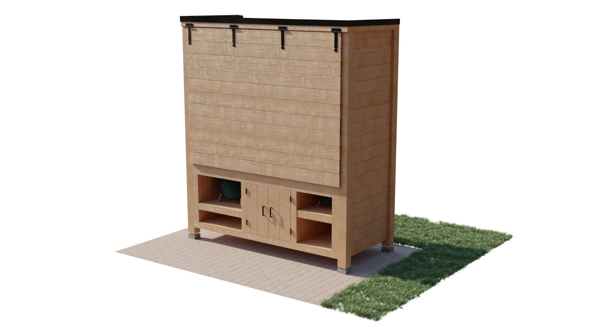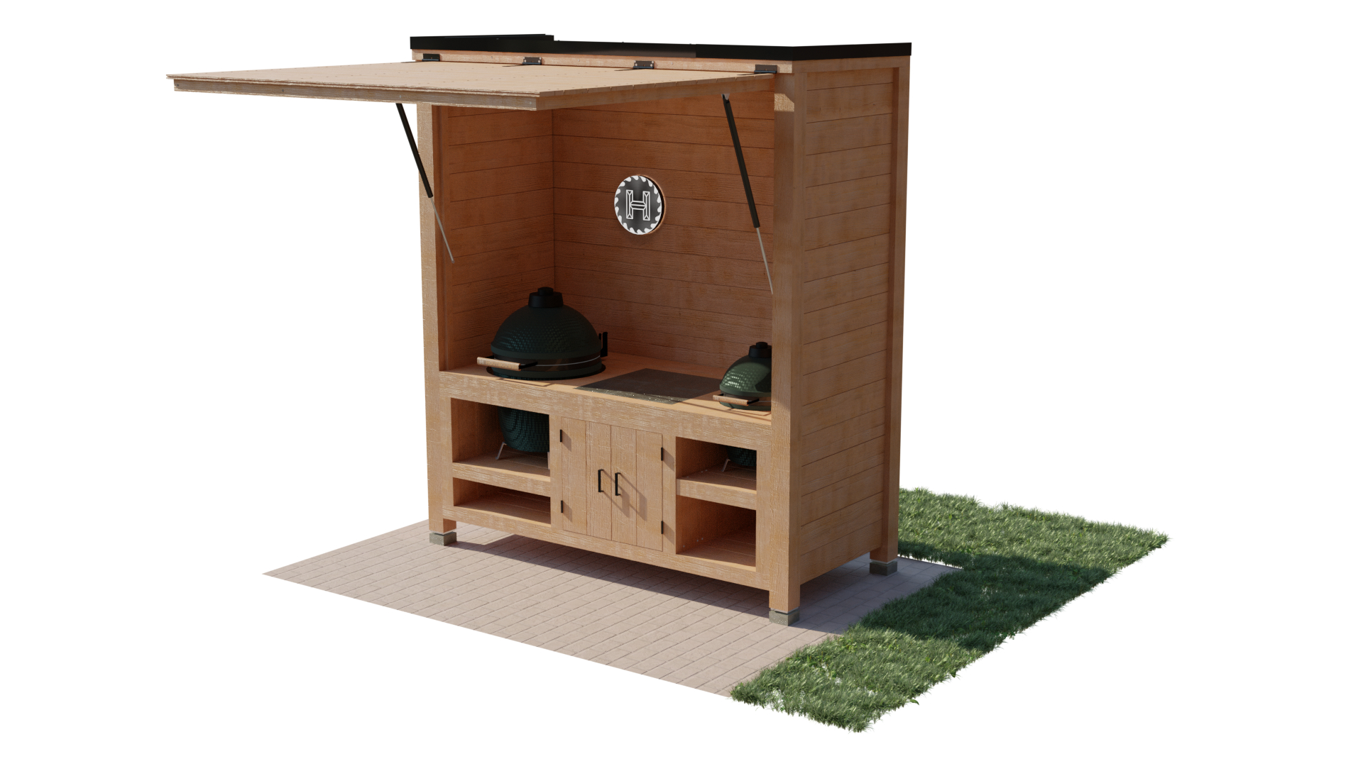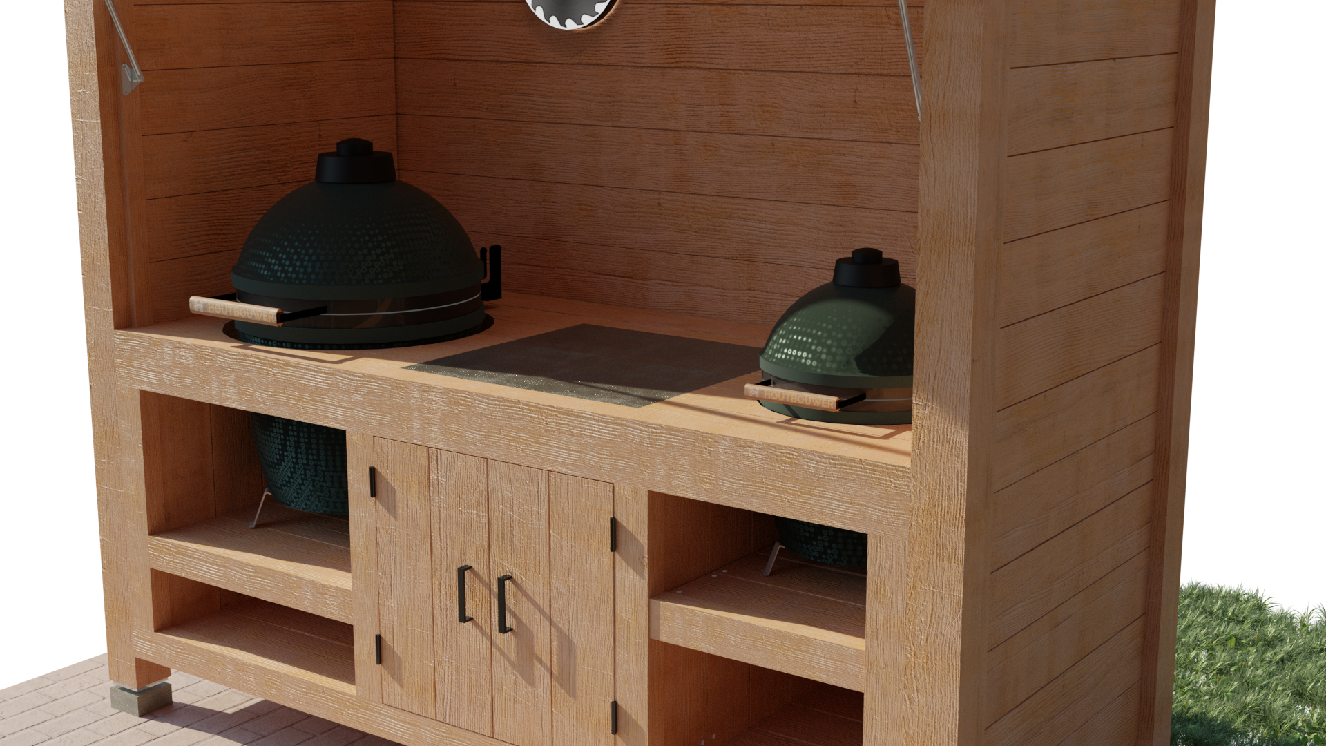 De ingebouwde tafel heeft plaats voor twee BBQ’s, welke je passend kunt maken op iedere barbecue, zoals de Big Green Egg, Grill guru en Weber, zolang deze onder een maximale hoogte en diameter blijft van 60cm. Ook heeft de buitenkeuken opbergruimte.