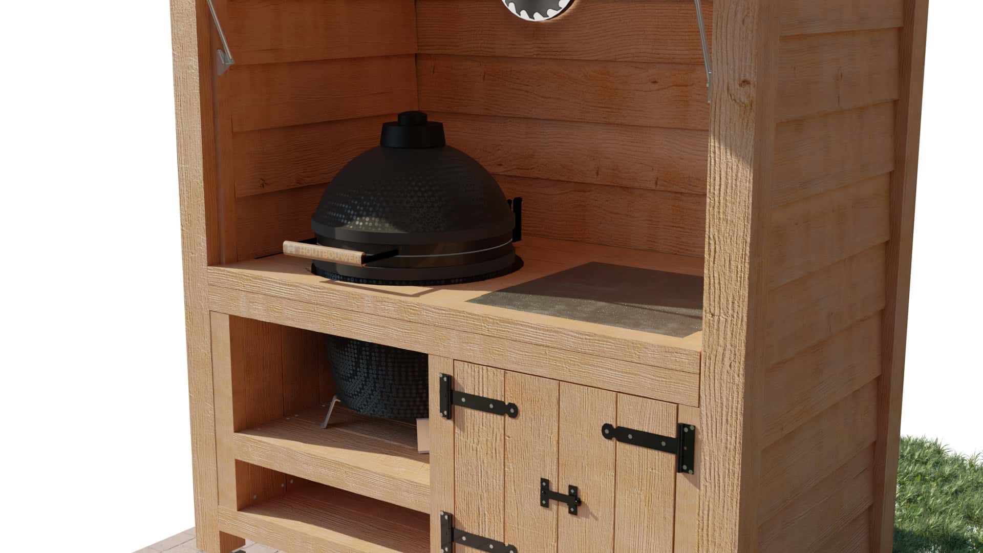 De ingebouwde tafel heeft een goede kastruimte aan de rechterzijde en in het midden is er plaats voor een BBQ welke je passend kunt maken op iedere barbecue, zoals de Big Green Egg, Grill guru en Weber, zolang deze onder een maximale hoogte en diameter blijft van 60cm.