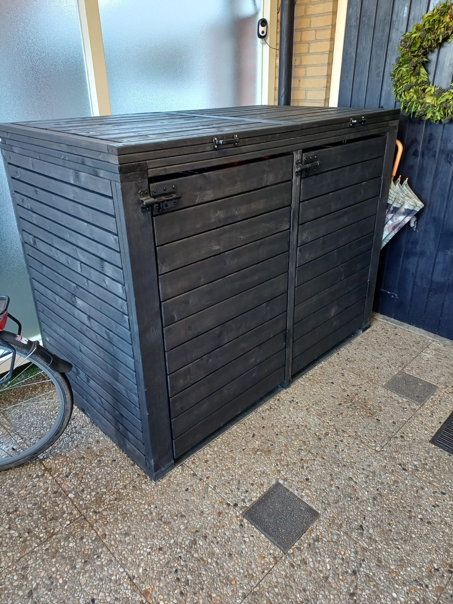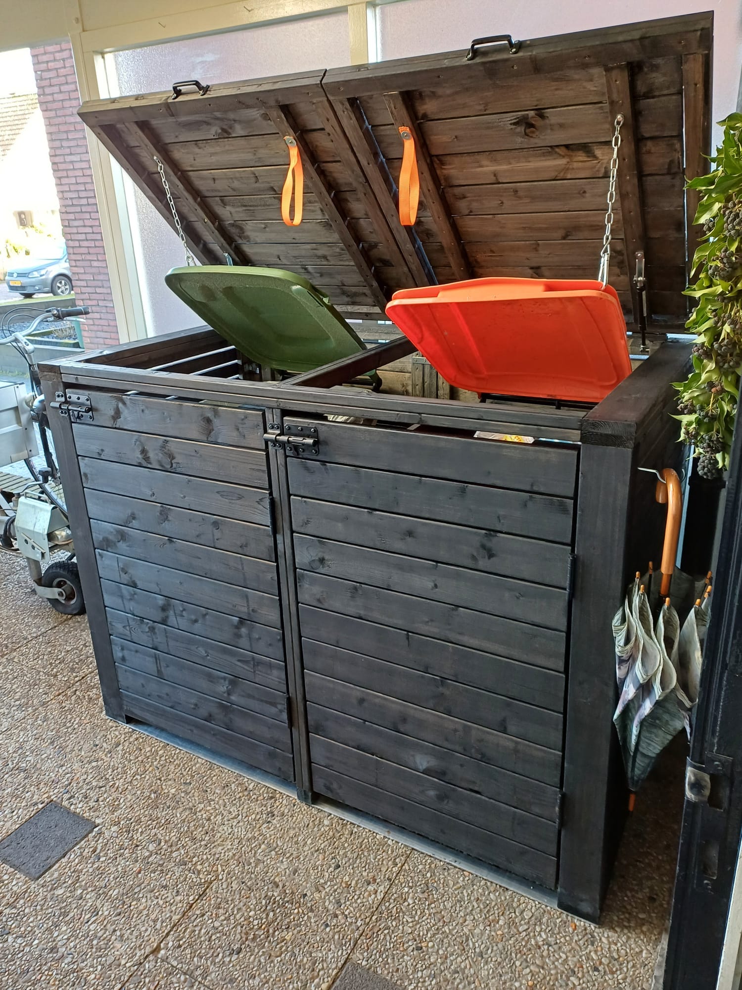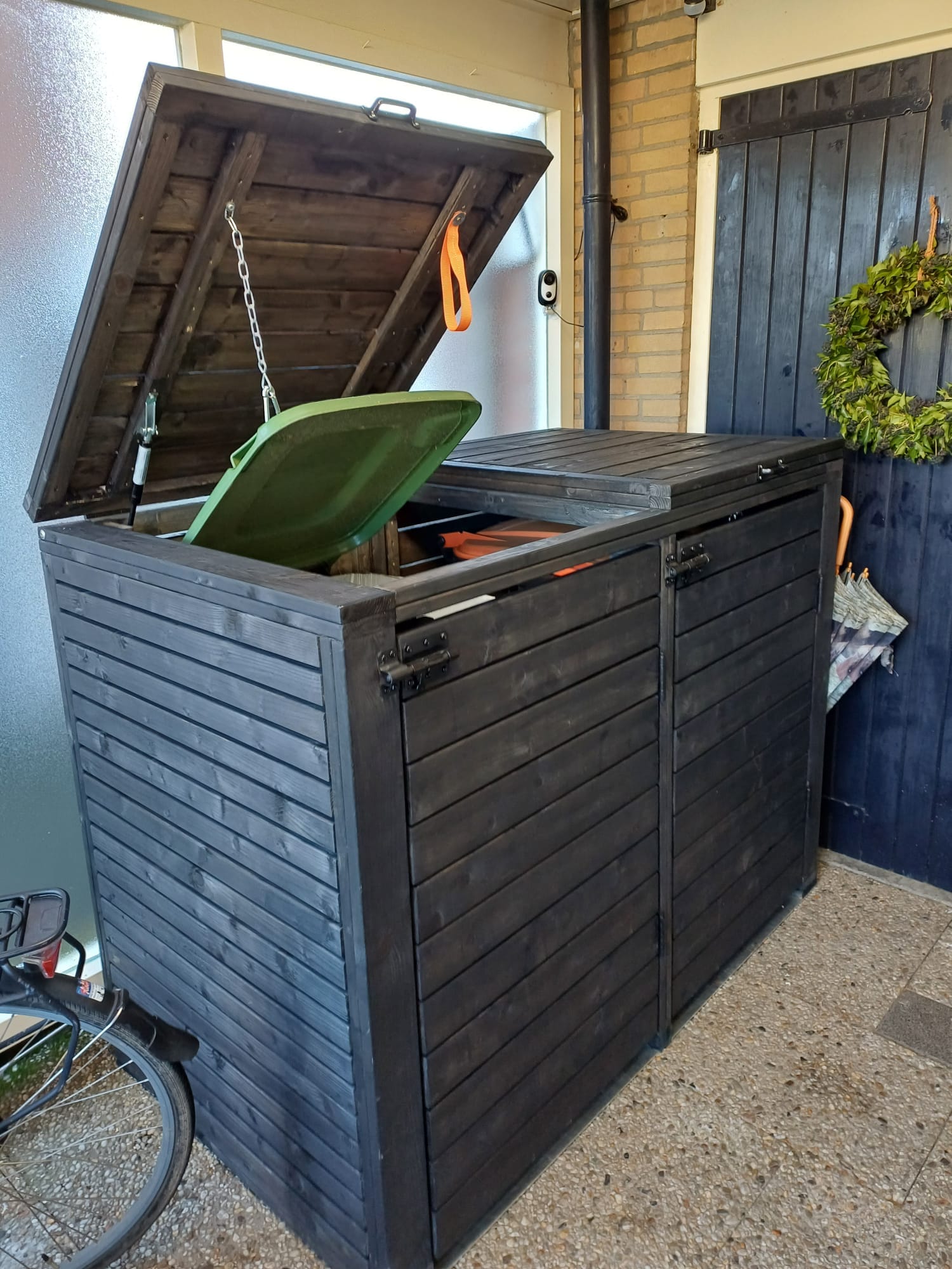 De ombouw is zo gemaakt dat er vrijwel geen schroeven zichtbaar zijn van buitenaf wat zorgt voor een super strak uiterlijk. Wanneer je de klep van de container ombouw open doet, gaat de klep van de afvalbak ook open middels kettingen.