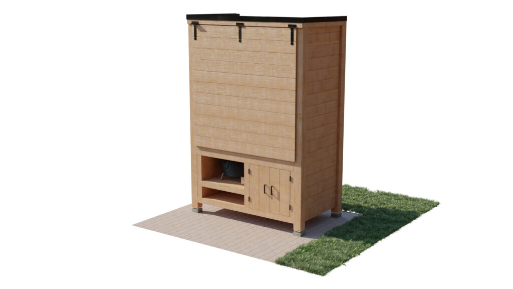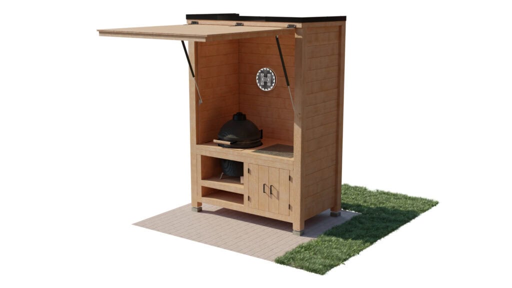 De ingebouwde tafel heeft een grote kastruimteaan de rechterkant. Aan de linkerkant is er plaats voor een BBQ welke je passend kunt maken op iedere barbecue, zoals de Big Green Egg, Grill guru en Weber, zolang deze onder een maximale hoogte en diameter blijft van 60cm.